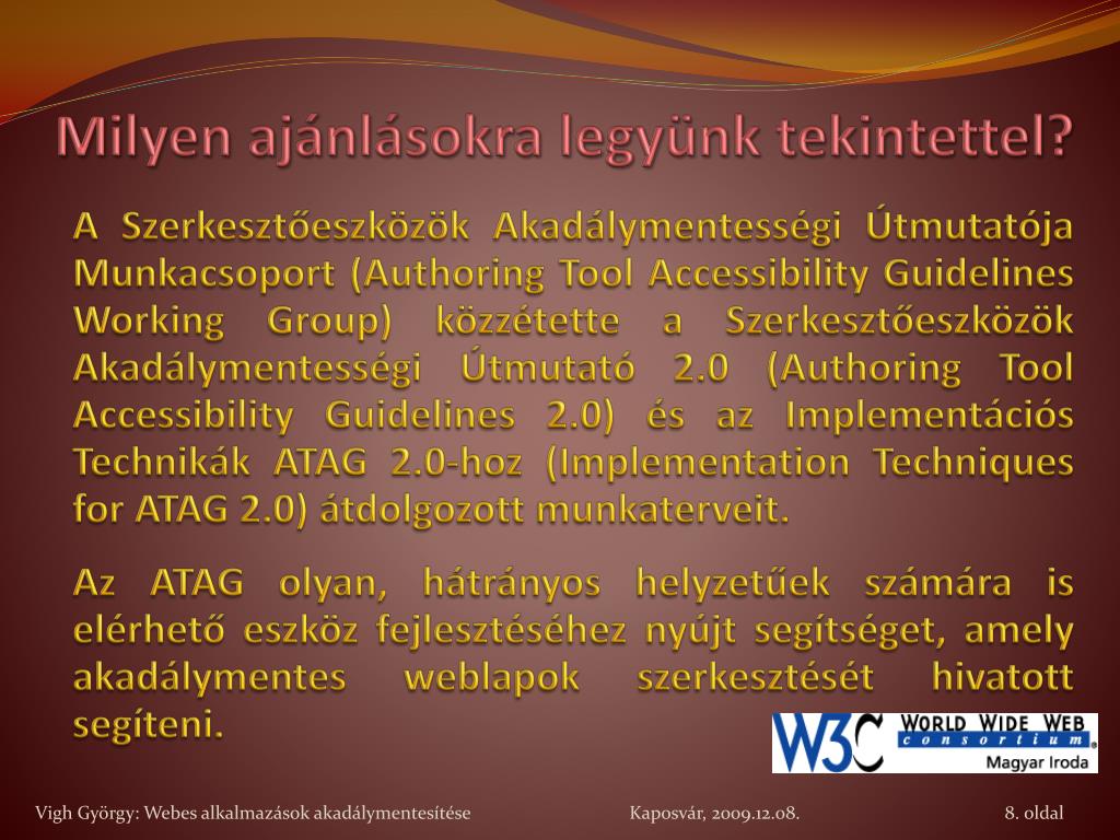 Milyen ajánlásokra legyünk tekintettel? • A Szerkesztőeszközök Akadálymentességi Útmutatója Munkacsoport (AuthoringToolAccessibilityGuidelinesWorking Group) közzétette a Szerkesztőeszközök Akadálymentességi Útmutató 2.0 (AuthoringToolAccessibilityGuidelines2.0) és az Implementációs Technikák ATAG 2.0-hoz (ImplementationTechniquesfor ATAG 2.0) átdolgozott munkaterveit. • Az ATAG olyan, hátrányos helyzetűek számára is elérhető eszköz fejlesztéséhez nyújt segítséget, amely akadálymentes weblapok szerkesztését hivatott segíteni. Vigh György: Webes alkalmazások akadálymentesítése Kaposvár, 2009.12.08.