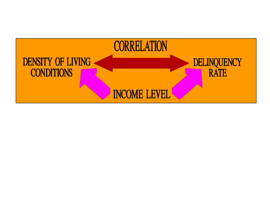 CORRELATION CAUTION IF TWO VARIABLES VARY TOGETHER, THEY ARE SAID TO BE CORRELATED. IN THIS EXAMPLE, DENSITY OF LIVING CONDITIONS AND JUVENILE DELINQUENCY INCREASE AND DECREASE TOGETHER.