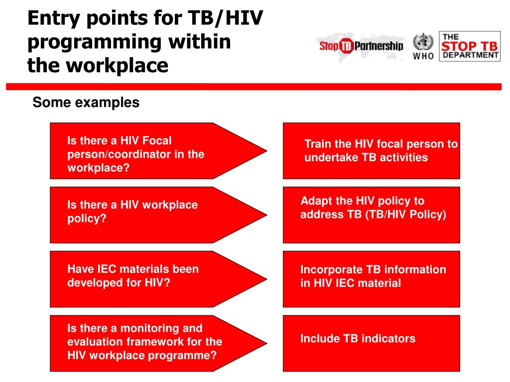 Entry points for TB/HIV programming within the workplace Some examples Is there a HIV Focal person/coordinator in the workplace? Train the HIV focal person to undertake TB activities Adapt the HIV policy to address TB (TB/HIV Policy) Is there a HIV workplace policy? Have IEC materials been developed for HIV? Incorporate TB information in HIV IEC material Is there a monitoring and evaluation framework for the HIV workplace programme? Include TB indicators