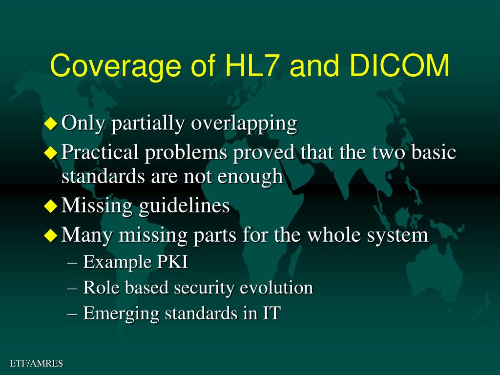 Coverage of HL7 and DICOM • Only partially overlapping • Practical problems proved that the two basic standards are not enough • Missing guidelines • Many missing parts for the whole system • Example PKI • Role based security evolution • Emerging standards in IT