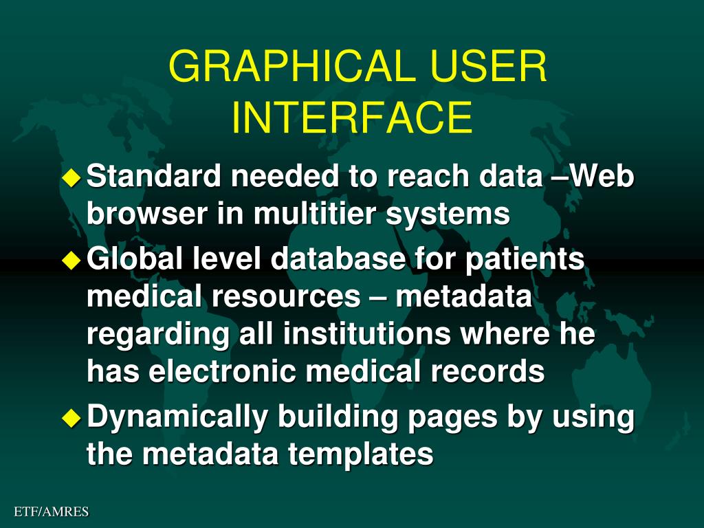 GRAPHICAL USER INTERFACE • Standard needed to reach data –Web browser in multitier systems • Global level database for patients medical resources – metadata regarding all institutions where he has electronic medical records • Dynamically building pages by using the metadata templates