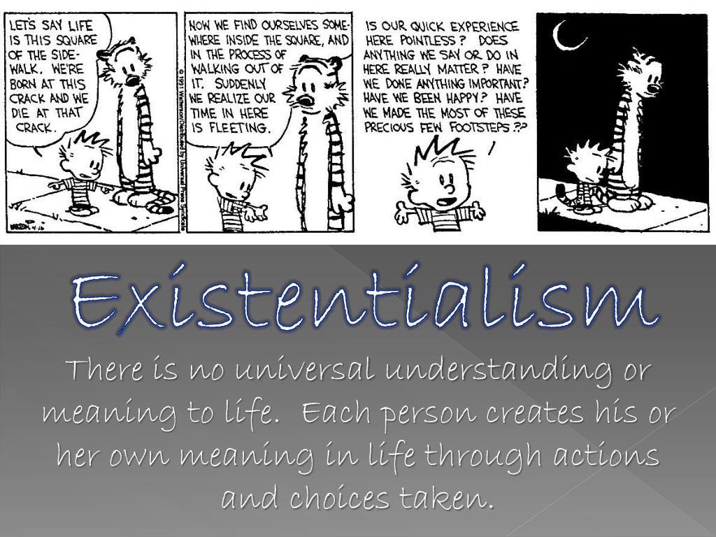 Existentialism There is no universal understanding or meaning to life. Each person creates his or her own meaning in life through actions and choices taken.