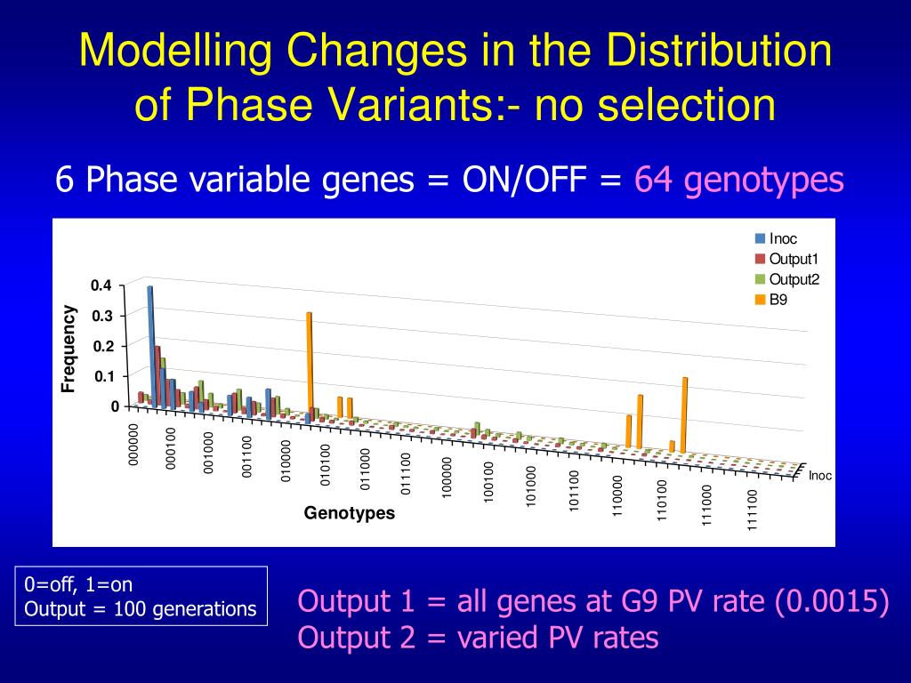 Modelling Changes in the Distribution of Phase Variants:- no selection 6 Phase variable genes = ON/OFF = 64 genotypes 0=off, 1=on Output = 100 generations Output 1 = all genes at G9 PV rate (0.0015) Output 2 = varied PV rates
