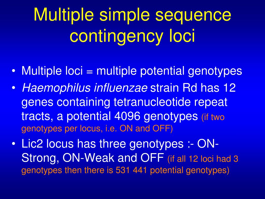 Multiple simple sequence contingency loci • Multiple loci = multiple potential genotypes • Haemophilus influenzae strain Rd has 12 genes containing tetranucleotide repeat tracts, a potential 4096 genotypes (if two genotypes per locus, i.e. ON and OFF) • Lic2 locus has three genotypes :- ON-Strong, ON-Weak and OFF (if all 12 loci had 3 genotypes then there is 531 441 potential genotypes)