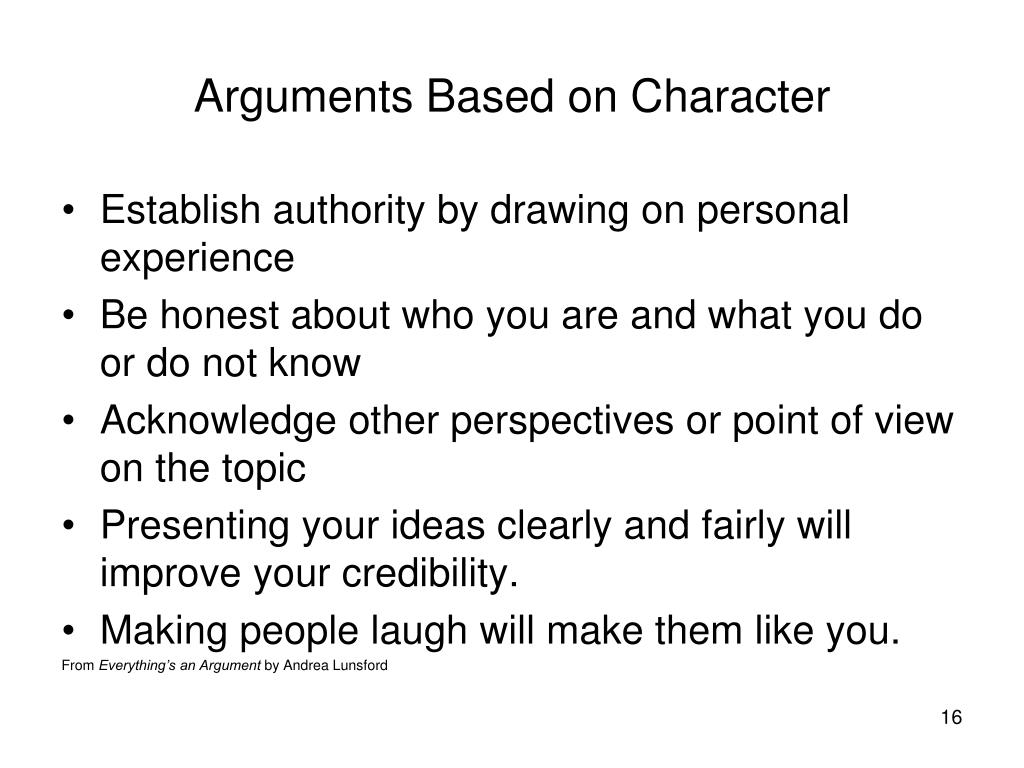 Arguments Based on Character • Establish authority by drawing on personal experience • Be honest about who you are and what you do or do not know • Acknowledge other perspectives or point of view on the topic • Presenting your ideas clearly and fairly will improve your credibility. • Making people laugh will make them like you. From Everything’s an Argument by Andrea Lunsford