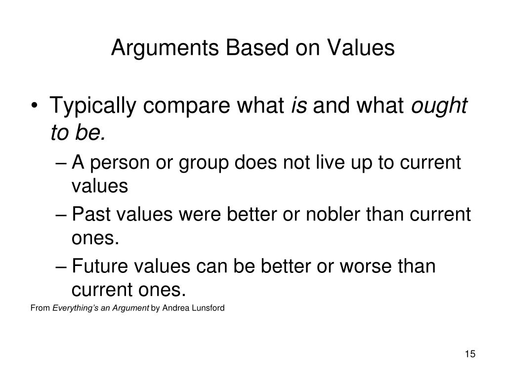 Arguments Based on Values • Typically compare what is and what ought to be. • A person or group does not live up to current values • Past values were better or nobler than current ones. • Future values can be better or worse than current ones. From Everything’s an Argument by Andrea Lunsford