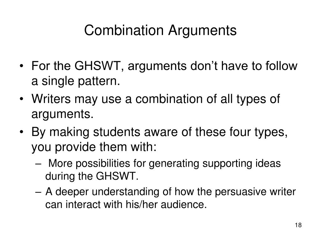 Combination Arguments • For the GHSWT, arguments don’t have to follow a single pattern. • Writers may use a combination of all types of arguments. • By making students aware of these four types, you provide them with: • More possibilities for generating supporting ideas during the GHSWT. • A deeper understanding of how the persuasive writer can interact with his/her audience.