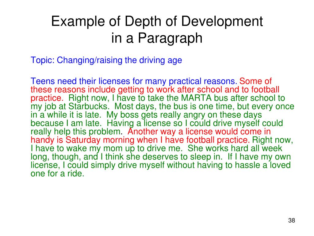 Example of Depth of Developmentin a Paragraph Topic: Changing/raising the driving age Teens need their licenses for many practical reasons.Some of these reasons include getting to work after school and to football practice.Right now, I have to take the MARTA bus after school to my job at Starbucks. Most days, the bus is one time, but every once in a while it is late. My boss gets really angry on these days because I am late. Having a license so I could drive myself could really help this problem. Another way a license would come in handy is Saturday morning when I have football practice. Right now, I have to wake my mom up to drive me. She works hard all week long, though, and I think she deserves to sleep in. If I have my own license, I could simply drive myself without having to hassle a loved one for a ride.