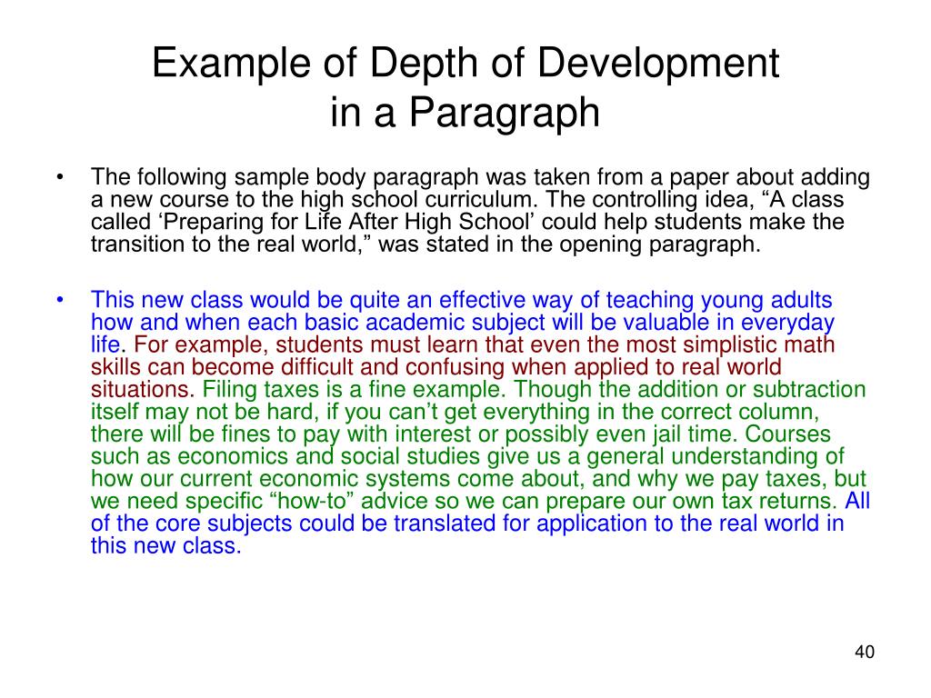 Example of Depth of Developmentin a Paragraph • The following sample body paragraph was taken from a paper about adding a new course to the high school curriculum. The controlling idea, “A class called ‘Preparing for Life After High School’ could help students make the transition to the real world,” was stated in the opening paragraph. • This new class would be quite an effective way of teaching young adults how and when each basic academic subject will be valuable in everyday life. For example, students must learn that even the most simplistic math skills can become difficult and confusing when applied to real world situations.Filing taxes is a fine example. Though the addition or subtraction itself may not be hard, if you can’t get everything in the correct column, there will be fines to pay with interest or possibly even jail time. Courses such as economics and social studies give us a general understanding of how our current economic systems come about, and why we pay taxes, but we need specific “how-to” advice so we can prepare our own tax returns.All of the core subjects could be translated for application to the real world in this new class.