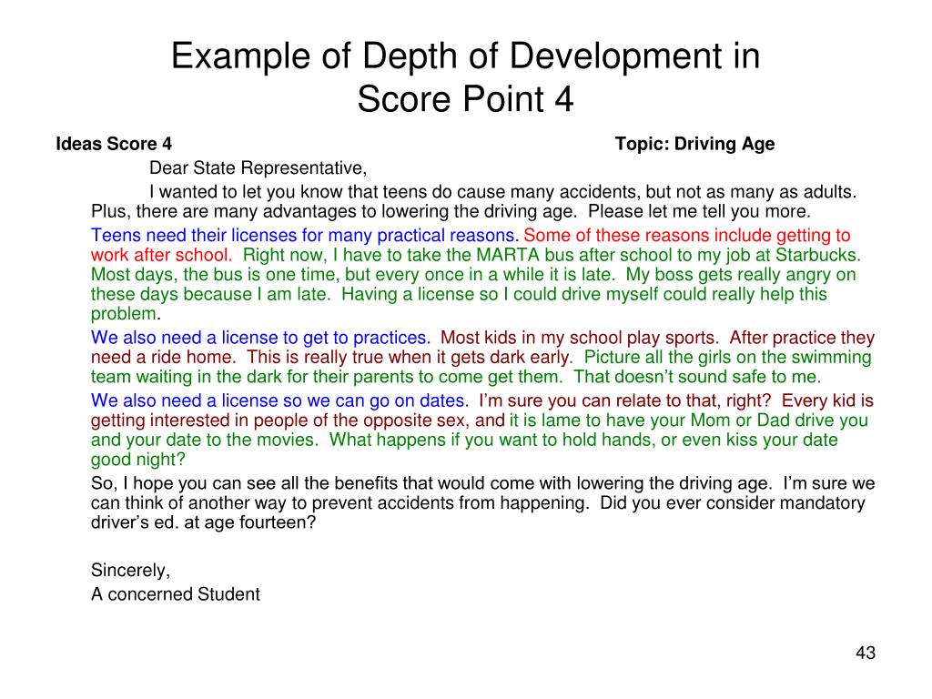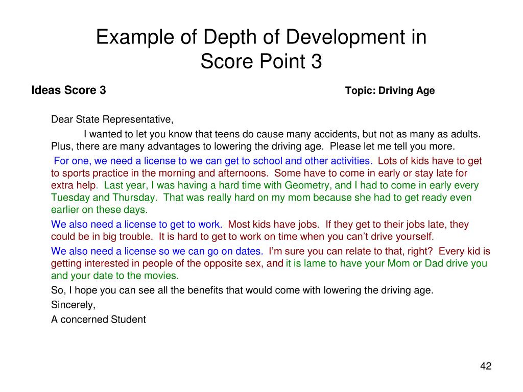 Example of Depth of Development in Score Point 4 Ideas Score 4 Topic: Driving Age Dear State Representative, I wanted to let you know that teens do cause many accidents, but not as many as adults. Plus, there are many advantages to lowering the driving age. Please let me tell you more. Teens need their licenses for many practical reasons.Some of these reasons include getting to work after school.Right now, I have to take the MARTA bus after school to my job at Starbucks. Most days, the bus is one time, but every once in a while it is late. My boss gets really angry on these days because I am late. Having a license so I could drive myself could really help this problem. We also need a license to get to practices. Most kids in my school play sports. After practice they need a ride home. This is really true when it gets dark early. Picture all the girls on the swimming team waiting in the dark for their parents to come get them. That doesn’t sound safe to me. We also need a license so we can go on dates. I’m sure you can relate to that, right? Every kid is getting interested in people of the opposite sex, and it is lame to have your Mom or Dad drive you and your date to the movies. What happens if you want to hold hands, or even kiss your date good night? So, I hope you can see all the benefits that would come with lowering the driving age. I’m sure we can think of another way to prevent accidents from happening. Did you ever consider mandatory driver’s ed. at age fourteen? Sincerely, A concerned Student