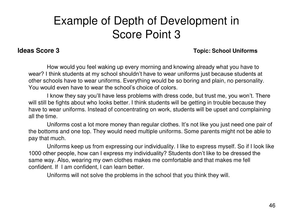 Example of Depth of Development in Score Point 3 Ideas Score 3 Topic: School Uniforms How would you feel waking up every morning and knowing already what you have to wear? I think students at my school shouldn’t have to wear uniforms just because students at other schools have to wear uniforms. Everything would be so boring and plain, no personality. You would even have to wear the school’s choice of colors. I know they say you’ll have less problems with dress code, but trust me, you won’t. There will still be fights about who looks better. I think students will be getting in trouble because they have to wear uniforms. Instead of concentrating on work, students will be upset and complaining all the time. Uniforms cost a lot more money than regular clothes. It’s not like you just need one pair of the bottoms and one top. They would need multiple uniforms. Some parents might not be able to pay that much. Uniforms keep us from expressing our individuality. I like to express myself. So if I look like 1000 other people, how can I express my individuality? Students don’t like to be dressed the same way. Also, wearing my own clothes makes me comfortable and that makes me fell confident. If I am confident, I can learn better. Uniforms will not solve the problems in the school that you think they will.
