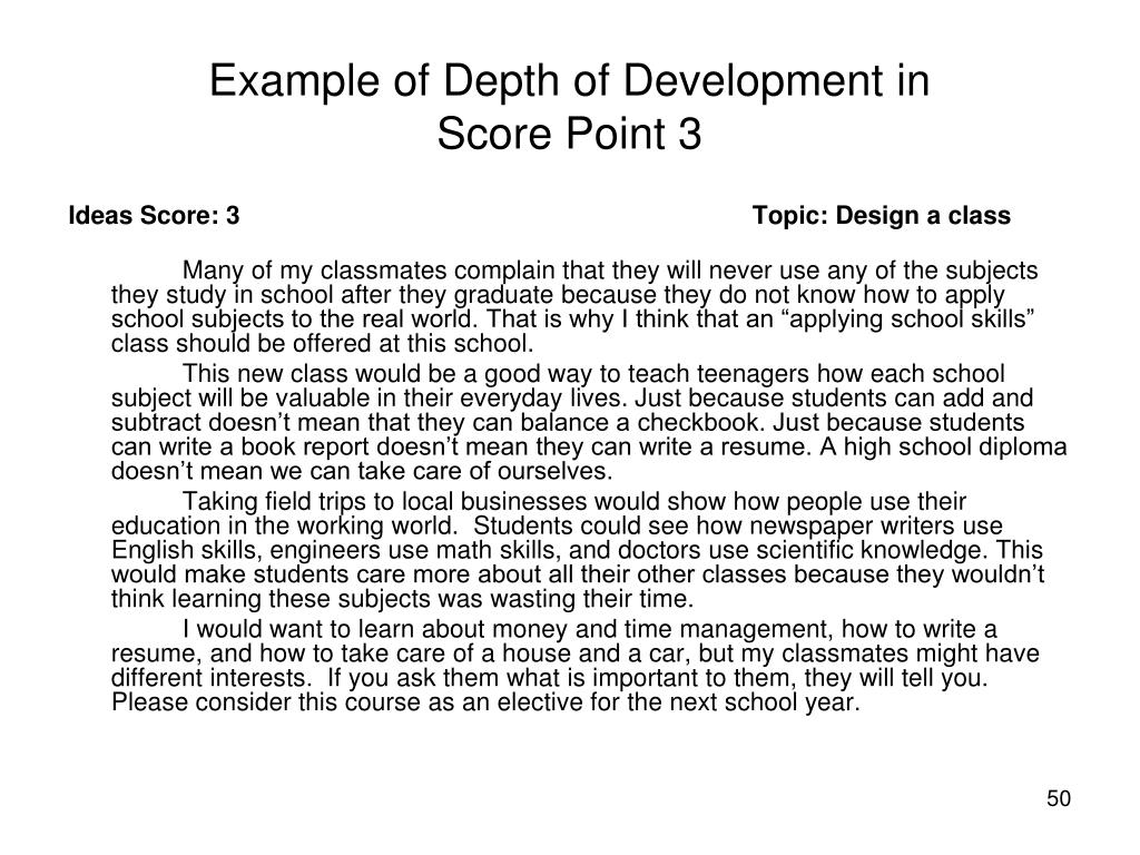 Example of Depth of Development in Score Point 3 Ideas Score: 3 Topic: Design a class Many of my classmates complain that they will never use any of the subjects they study in school after they graduate because they do not know how to apply school subjects to the real world. That is why I think that an “applying school skills” class should be offered at this school. This new class would be a good way to teach teenagers how each school subject will be valuable in their everyday lives. Just because students can add and subtract doesn’t mean that they can balance a checkbook. Just because students can write a book report doesn’t mean they can write a resume. A high school diploma doesn’t mean we can take care of ourselves. Taking field trips to local businesses would show how people use their education in the working world. Students could see how newspaper writers use English skills, engineers use math skills, and doctors use scientific knowledge. This would make students care more about all their other classes because they wouldn’t think learning these subjects was wasting their time. I would want to learn about money and time management, how to write a resume, and how to take care of a house and a car, but my classmates might have different interests. If you ask them what is important to them, they will tell you. Please consider this course as an elective for the next school year.