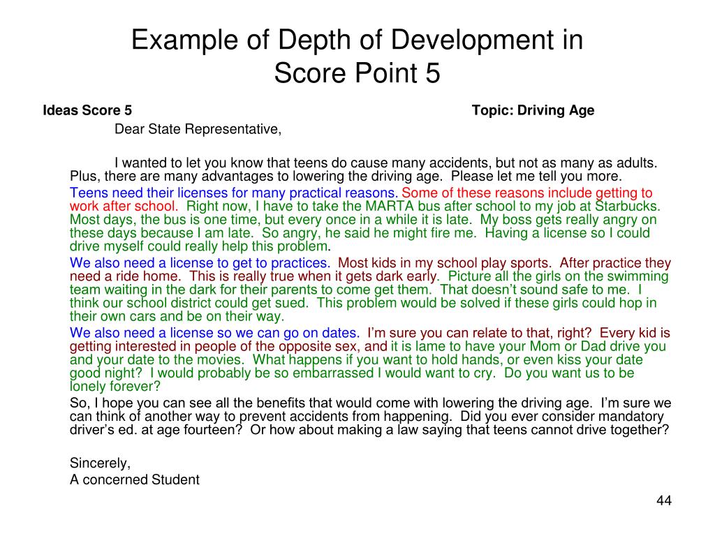 Example of Depth of Development in Score Point 5 Ideas Score 5 Topic: Driving Age Dear State Representative, I wanted to let you know that teens do cause many accidents, but not as many as adults. Plus, there are many advantages to lowering the driving age. Please let me tell you more. Teens need their licenses for many practical reasons.Some of these reasons include getting to work after school.Right now, I have to take the MARTA bus after school to my job at Starbucks. Most days, the bus is one time, but every once in a while it is late. My boss gets really angry on these days because I am late. So angry, he said he might fire me. Having a license so I could drive myself could really help this problem. We also need a license to get to practices. Most kids in my school play sports. After practice they need a ride home. This is really true when it gets dark early. Picture all the girls on the swimming team waiting in the dark for their parents to come get them. That doesn’t sound safe to me. I think our school district could get sued. This problem would be solved if these girls could hop in their own cars and be on their way. We also need a license so we can go on dates. I’m sure you can relate to that, right? Every kid is getting interested in people of the opposite sex, and it is lame to have your Mom or Dad drive you and your date to the movies. What happens if you want to hold hands, or even kiss your date good night? I would probably be so embarrassed I would want to cry. Do you want us to be lonely forever? So, I hope you can see all the benefits that would come with lowering the driving age. I’m sure we can think of another way to prevent accidents from happening. Did you ever consider mandatory driver’s ed. at age fourteen? Or how about making a law saying that teens cannot drive together? Sincerely, A concerned Student