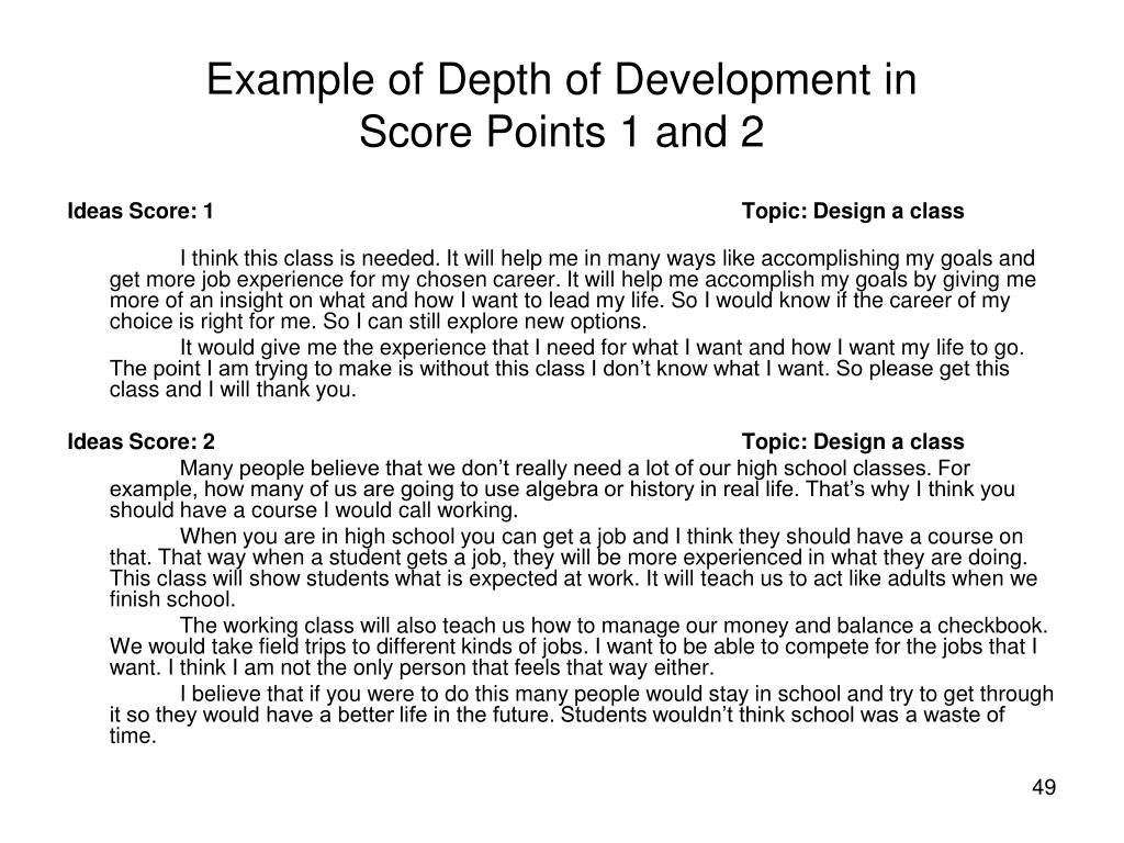 Example of Depth of Development in Score Points 1 and 2 Ideas Score: 1 Topic: Design a class I think this class is needed. It will help me in many ways like accomplishing my goals and get more job experience for my chosen career. It will help me accomplish my goals by giving me more of an insight on what and how I want to lead my life. So I would know if the career of my choice is right for me. So I can still explore new options. It would give me the experience that I need for what I want and how I want my life to go. The point I am trying to make is without this class I don’t know what I want. So please get this class and I will thank you. Ideas Score: 2 Topic: Design a class Many people believe that we don’t really need a lot of our high school classes. For example, how many of us are going to use algebra or history in real life. That’s why I think you should have a course I would call working. When you are in high school you can get a job and I think they should have a course on that. That way when a student gets a job, they will be more experienced in what they are doing. This class will show students what is expected at work. It will teach us to act like adults when we finish school. The working class will also teach us how to manage our money and balance a checkbook. We would take field trips to different kinds of jobs. I want to be able to compete for the jobs that I want. I think I am not the only person that feels that way either. I believe that if you were to do this many people would stay in school and try to get through it so they would have a better life in the future. Students wouldn’t think school was a waste of time.