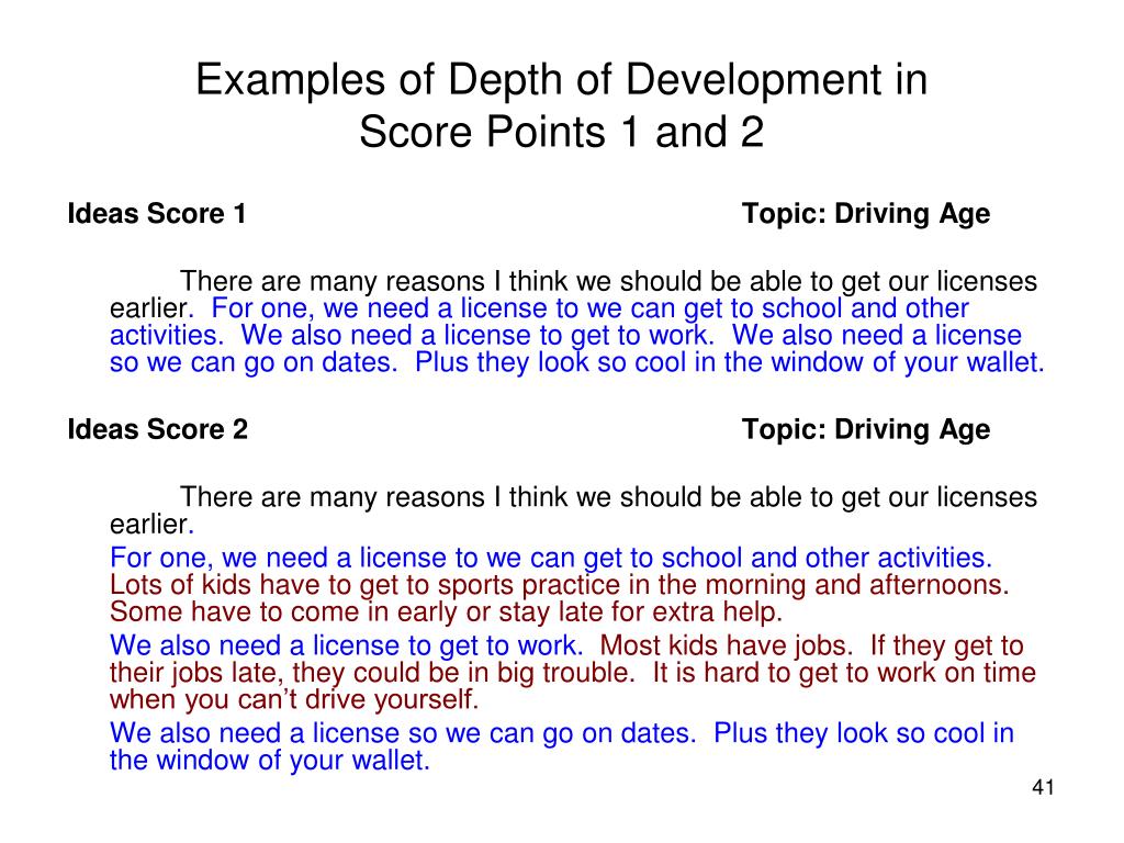 Examples of Depth of Development in Score Points 1 and 2 Ideas Score 1 Topic: Driving Age There are many reasons I think we should be able to get our licenses earlier. For one, we need a license to we can get to school and other activities. We also need a license to get to work. We also need a license so we can go on dates. Plus they look so cool in the window of your wallet. Ideas Score 2 Topic: Driving Age There are many reasons I think we should be able to get our licenses earlier. For one, we need a license to we can get to school and other activities. Lots of kids have to get to sports practice in the morning and afternoons. Some have to come in early or stay late for extra help. We also need a license to get to work. Most kids have jobs. If they get to their jobs late, they could be in big trouble. It is hard to get to work on time when you can’t drive yourself. We also need a license so we can go on dates. Plus they look so cool in the window of your wallet.