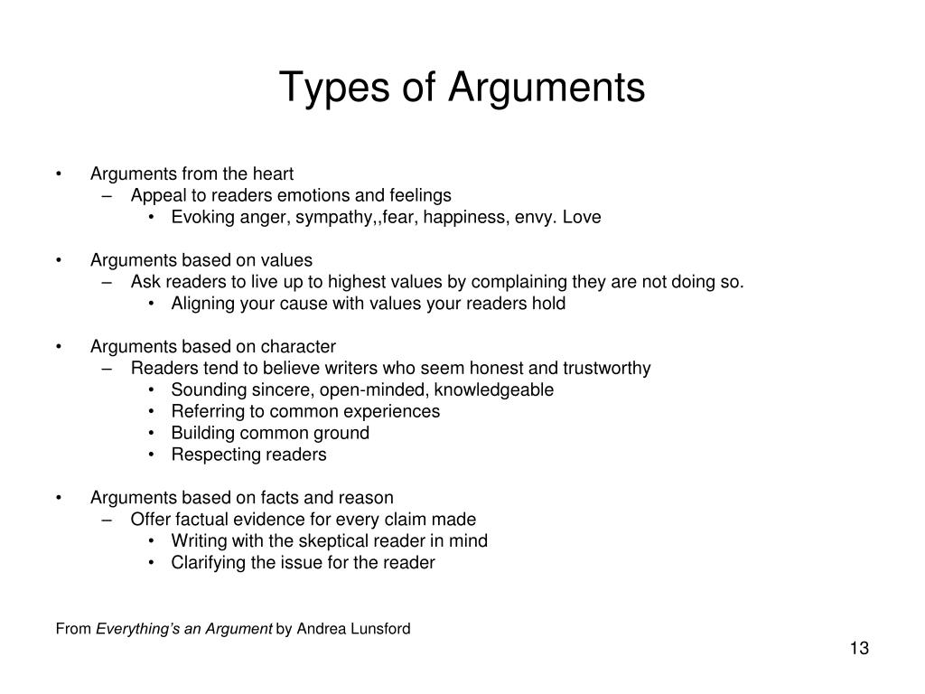 Arguments Based on Facts and Reason • Furnishing detailed evidence for every claim made in an argument • Facts make strong arguments • May employ the writer’s personal experiences From Everything’s an Argument by Andrea Lunsford