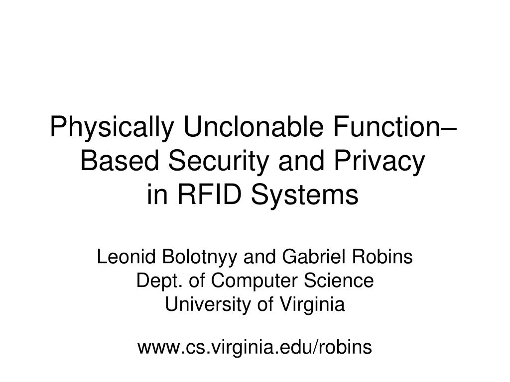 Physically Unclonable Function–Based Security and Privacy in RFID Systems Leonid Bolotnyy and Gabriel Robins Dept. of Computer Science University of Virginia www.cs.virginia.edu/robins