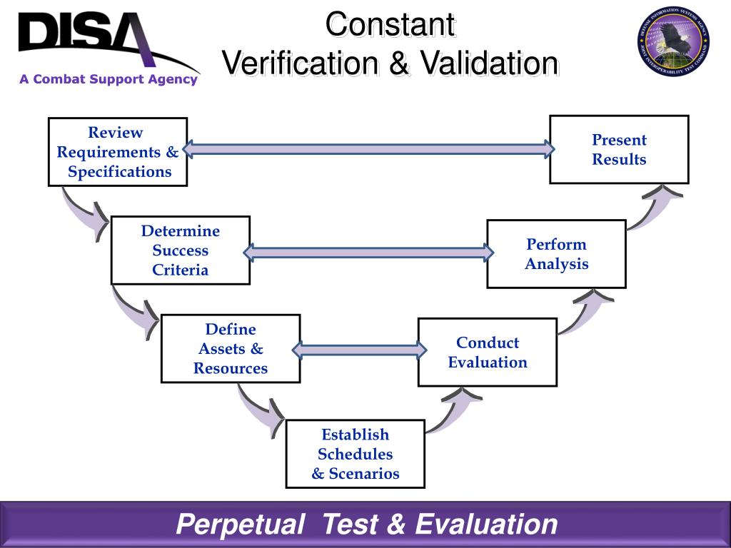 Constant Verification & Validation Present Results Review Requirements & Specifications Determine Success Criteria Perform Analysis Define Assets & Resources Conduct Evaluation Establish Schedules & Scenarios Perpetual Test & Evaluation