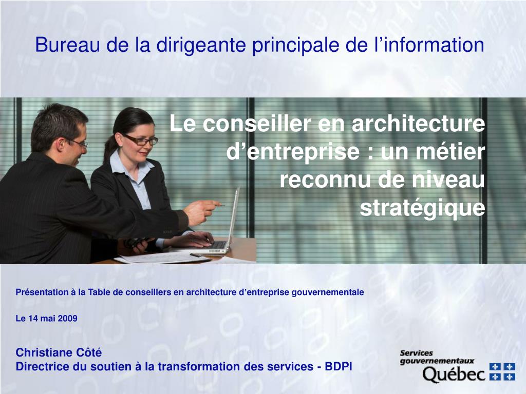 Bureau de la dirigeante principale de l’information. Le conseiller en architecture d’entreprise : un métier reconnu de niveau stratégique. Présentation à la Table de conseillers en architecture d’entreprise gouvernementale Le 14 mai 2009 Christiane Côté