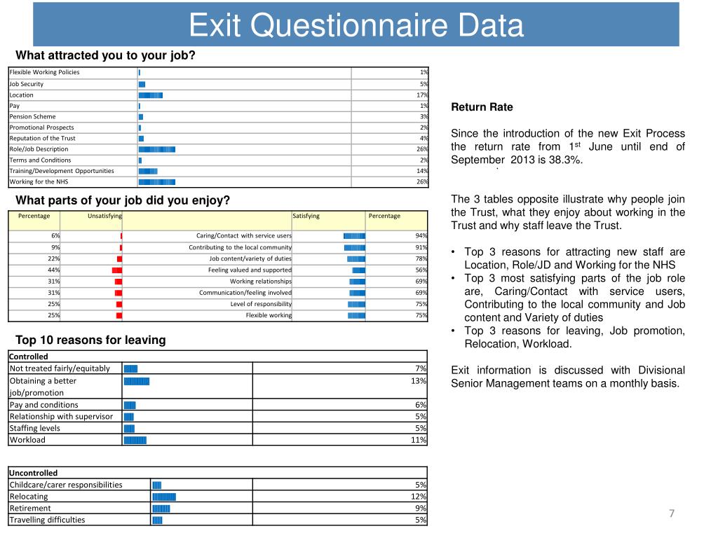 4. Exit Questionnaire Data What attracted you to your job? • Return Rate • Since the introduction of the new Exit Process the return rate from 1st June until end of September 2013 is38.3%. • The 3 tables opposite illustrate why people join the Trust, what they enjoy about working in the Trust and why staff leave the Trust. • Top 3 reasons for attracting new staff are Location, Role/JD and Working for the NHS • Top 3 most satisfying parts of the job role are, Caring/Contact with service users, Contributing to the local community and Job content and Variety of duties • Top 3 reasons for leaving, Job promotion, Relocation, Workload. • Exit information is discussed with Divisional Senior Management teams on a monthly basis. . What parts of your job did you enjoy? Top 10 reasons for leaving