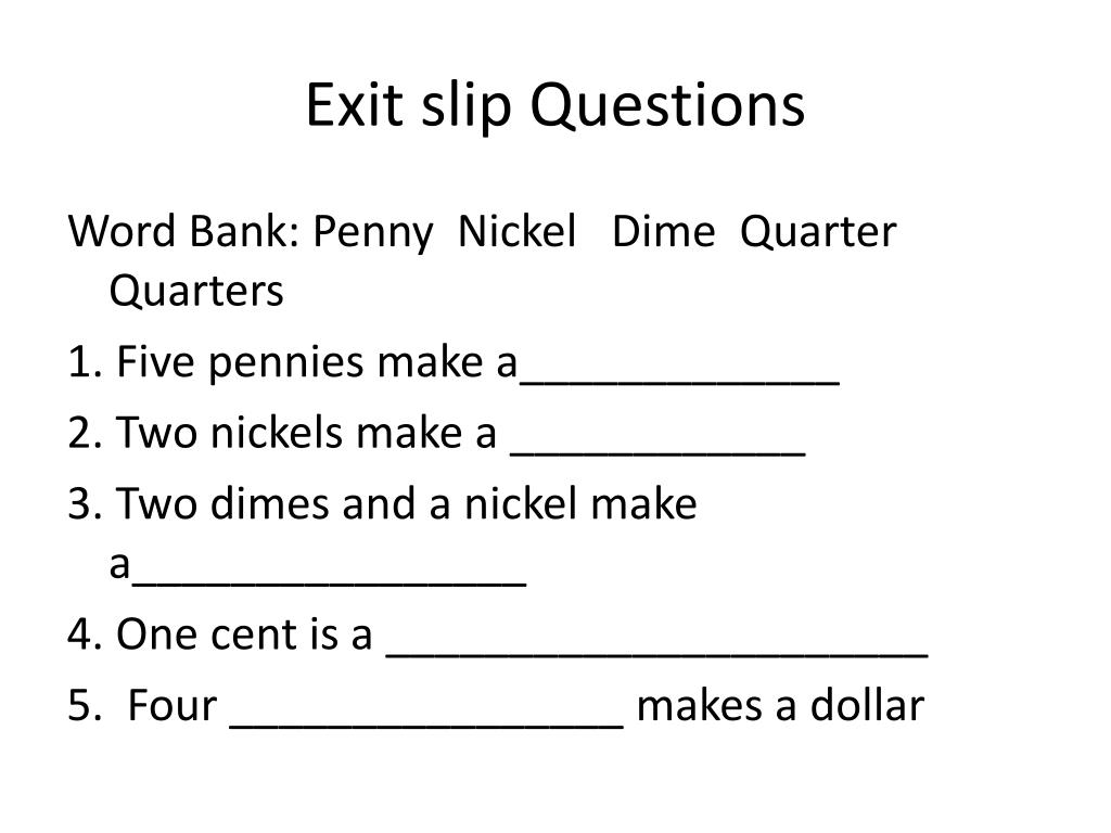 Exit slip Questions Word Bank: Penny Nickel Dime Quarter Quarters 1. Five pennies make a_____________ 2. Two nickels make a ____________ 3. Two dimes and a nickel make a________________ 4. One cent is a ______________________ 5. Four ________________ makes a dollar