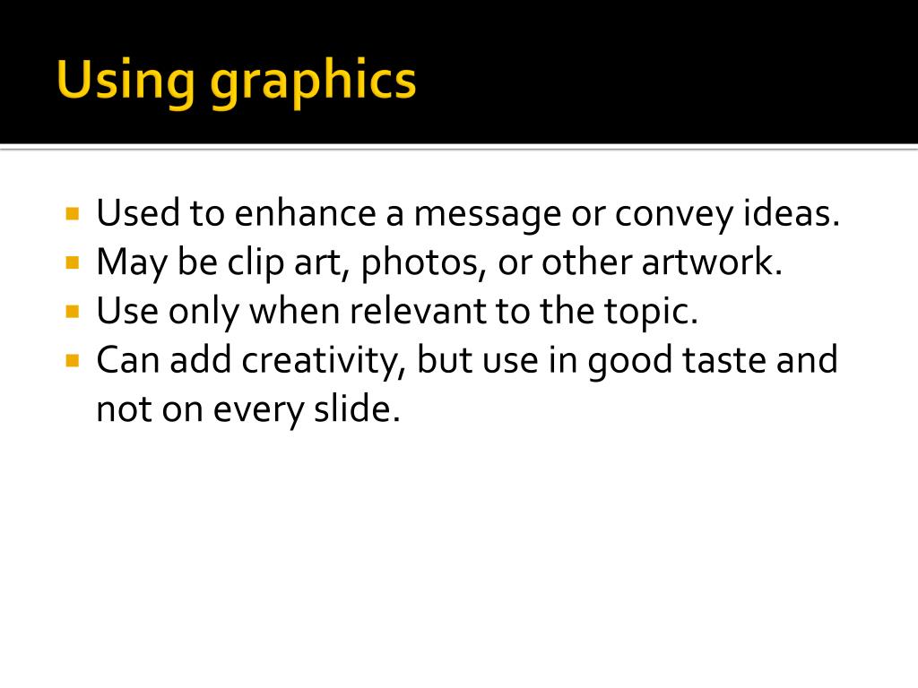 Using graphics • Used to enhance a message or convey ideas. • May be clip art, photos, or other artwork. • Use only when relevant to the topic. • Can add creativity, but use in good taste and not on every slide.