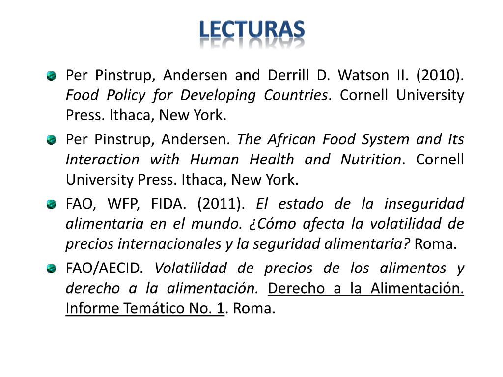 LECTURAS • Per Pinstrup, Andersen and Derrill D. Watson II. (2010). Food Policy for Developing Countries. Cornell University Press. Ithaca, New York. • Per Pinstrup, Andersen. The African Food System and Its Interaction with Human Health and Nutrition. Cornell University Press. Ithaca, New York. • FAO, WFP, FIDA. (2011). El estado de la inseguridad alimentaria en el mundo. ¿Cómo afecta la volatilidad de precios internacionales y la seguridad alimentaria? Roma. • FAO/AECID. Volatilidad de precios de los alimentos y derecho a la alimentación.Derecho a la Alimentación. Informe Temático No. 1. Roma.