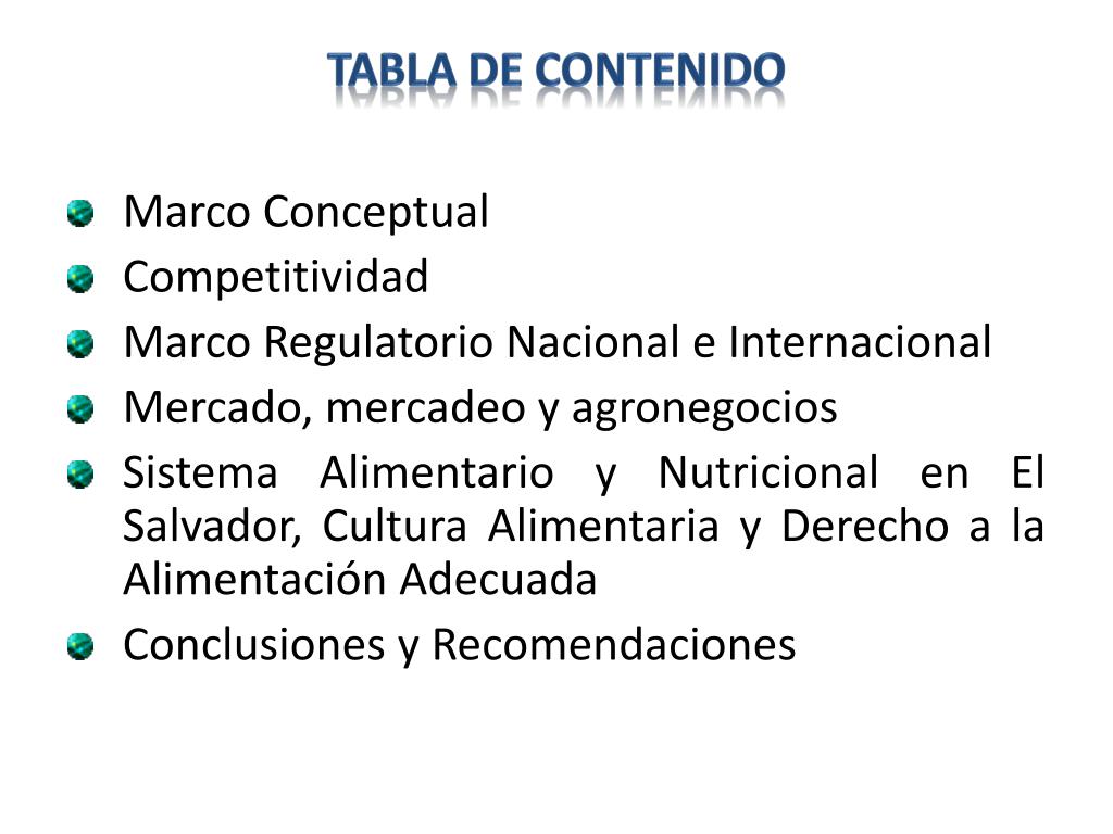 Tabla de contenido • Marco Conceptual • Competitividad • Marco Regulatorio Nacional e Internacional • Mercado, mercadeo y agronegocios • Sistema Alimentario y Nutricional en El Salvador, Cultura Alimentaria y Derecho a la Alimentación Adecuada • Conclusiones y Recomendaciones