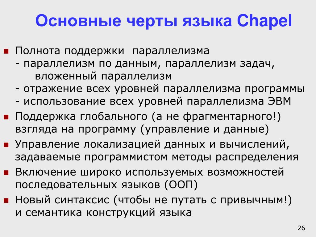 Основные черты языка Chapel Полнота поддержки параллелизма- параллелизм по данным, параллелизм задач, вложенный параллелизм- отражение всех уровней параллелизма программы- использование всех уровней параллелизма ЭВМ Поддержка глобального (а не фрагментарного!) взгляда на программу (управление и данные) Управление локализацией данных и вычислений, задаваемые программистом методы распределения Включение широко используемых возможностей последовательных языков (ООП) Новый синтаксис (чтобы не путать с привычным!)и семантика конструкций языка