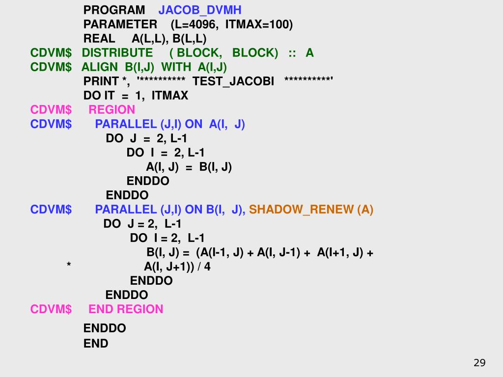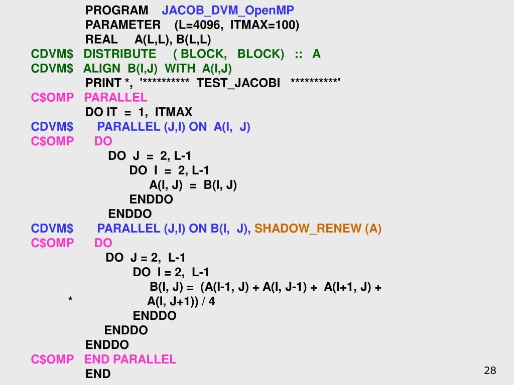 PROGRAM JACOB_SEQ • PARAMETER (L=8, ITMAX=20) • REAL A(L,L), B(L,L) • PRINT *, '********** TEST_JACOBI **********' • DO IT = 1, ITMAX • DO J = 2, L-1 • DO I = 2, L-1 • A(I, J) = B(I, J) • ENDDO • ENDDO • DO J = 2, L-1 • DO I = 2, L-1 • B(I, J) = (A(I-1, J) + A(I, J-1) + A(I+1, J) + • * A(I, J+1)) / 4 • ENDDO • ENDDO • ENDDO • END АлгоритмЯкоби на языке Fortran