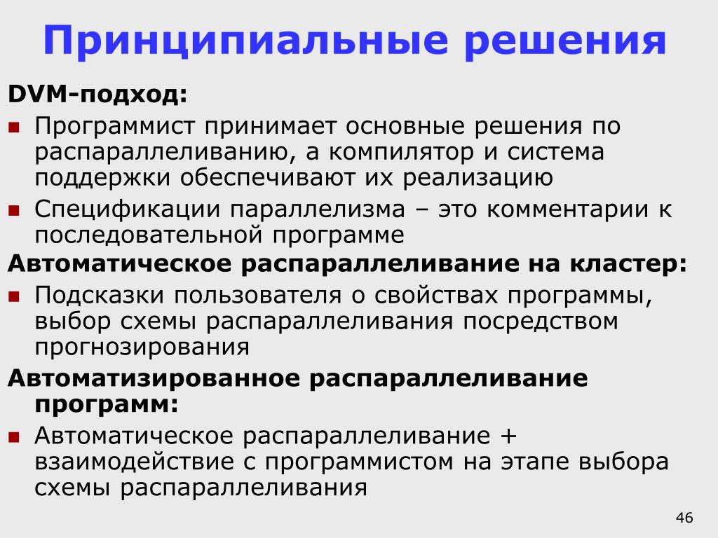 Принципиальные решения DVM-подход: • Программист принимает основные решения по распараллеливанию, а компилятор и система поддержки обеспечивают их реализацию • Спецификации параллелизма – это комментарии к последовательной программе Автоматическое распараллеливание на кластер: • Подсказки пользователя о свойствах программы, выбор схемы распараллеливания посредством прогнозирования Автоматизированное распараллеливание программ: • Автоматическое распараллеливание + взаимодействие с программистом на этапе выбора схемы распараллеливания
