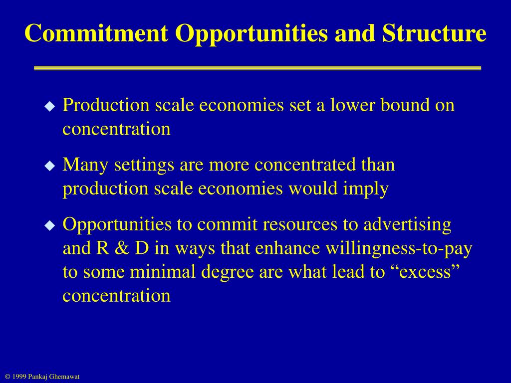 Commitment Opportunities and Structure • Production scale economies set a lower bound on concentration • Many settings are more concentrated than production scale economies would imply • Opportunities to commit resources to advertising and R & D in ways that enhance willingness-to-pay to some minimal degree are what lead to “excess” concentration
