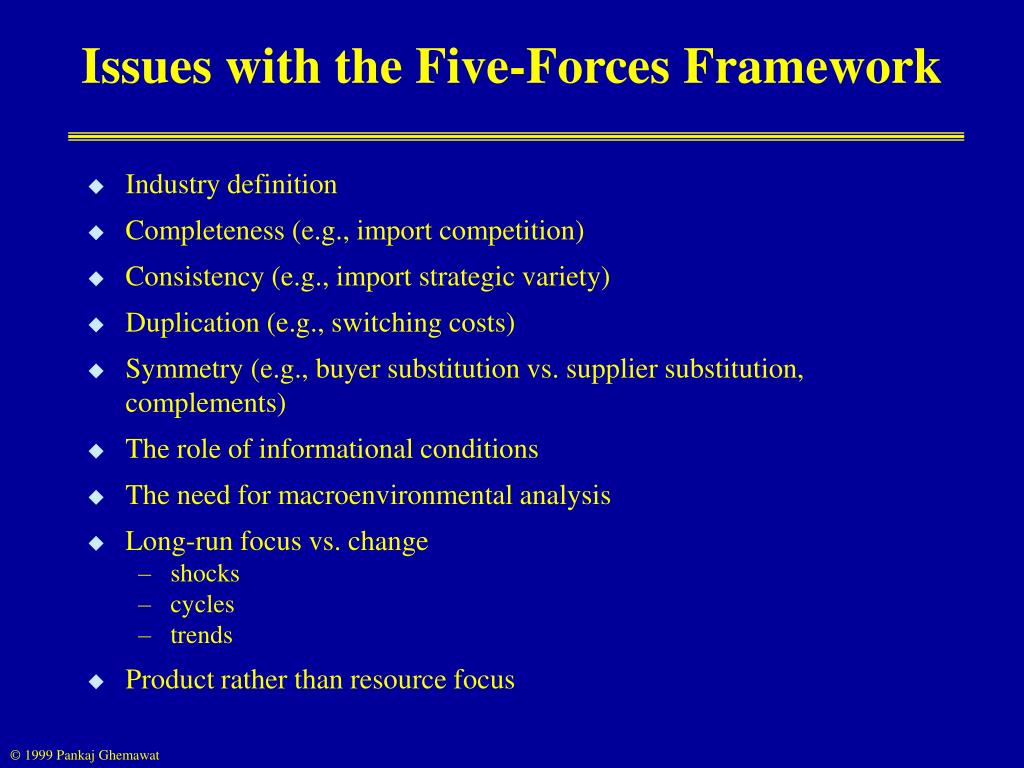 Issues with the Five-Forces Framework • Industry definition • Completeness (e.g., import competition) • Consistency (e.g., import strategic variety) • Duplication (e.g., switching costs) • Symmetry (e.g., buyer substitution vs. supplier substitution, complements) • The role of informational conditions • The need for macroenvironmental analysis • Long-run focus vs. change • shocks • cycles • trends • Product rather than resource focus