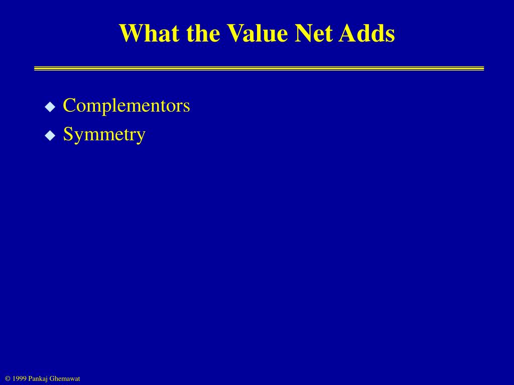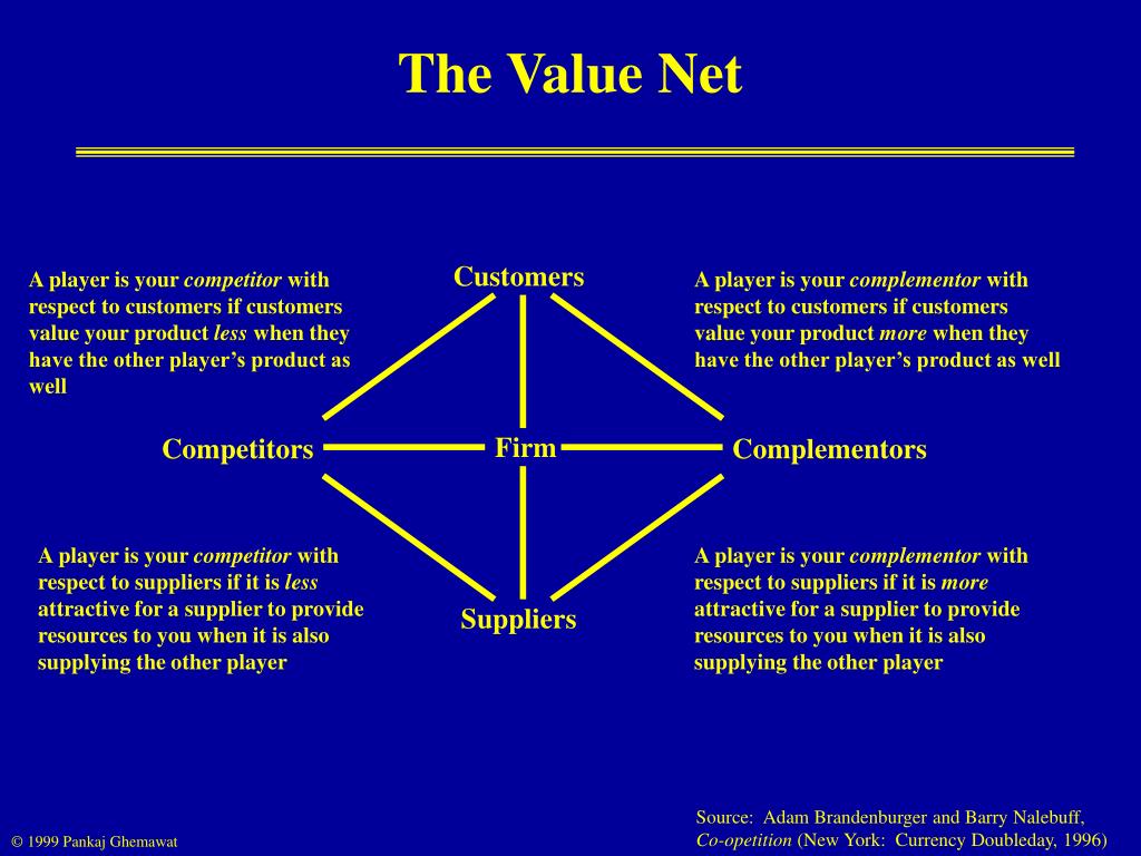 The Value Net Customers Company Competitors Complementors Suppliers Source: Adam Brandenburger and Barry Nalebuff, Co-opetition (New York: Currency Doubleday, 1996), p. 17