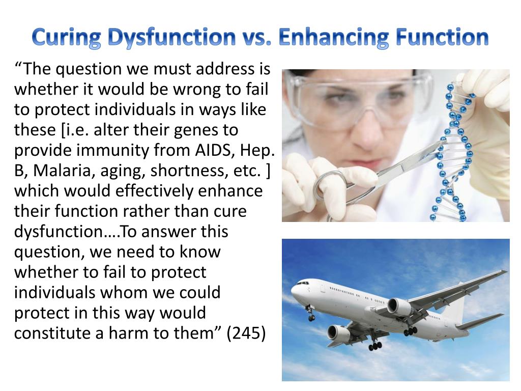 Curing Dysfunction vs. Enhancing Function “The question we must address is whether it would be wrong to fail to protect individuals in ways like these [i.e. alter their genes to provide immunity from AIDS, Hep. B, Malaria, aging, shortness, etc. ] which would effectively enhance their function rather than cure dysfunction….To answer this question, we need to know whether to fail to protect individuals whom we could protect in this way would constitute a harm to them” (245)
