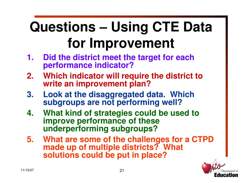 Questions – Using CTE Data for Improvement • Did the district meet the target for each performance indicator? • Which indicator will require the district to write an improvement plan? • Look at the disaggregated data. Which subgroups are not performing well? • What kind of strategies could be used to improve performance of these underperforming subgroups? • What are some of the challenges for a CTPD made up of multiple districts? What solutions could be put in place? 21