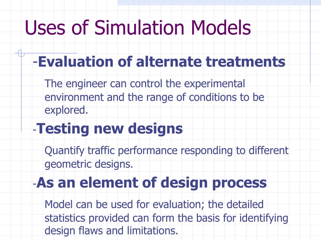 Uses of Simulation Models -Evaluation of alternate treatments The engineer can control the experimental environment and the range of conditions to be explored. -Testing new designs Quantifytraffic performance responding to different geometric designs. -As an element of design process Model can be used for evaluation; the detailed statistics provided can form the basis for identifying design flaws and limitations.