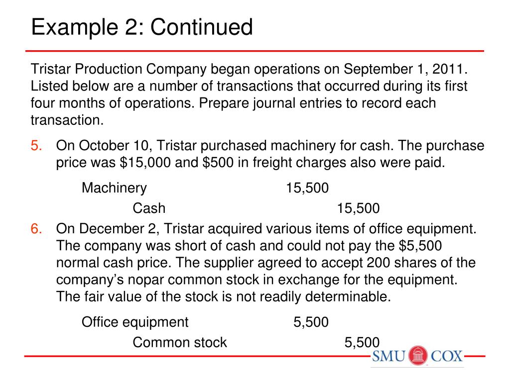 Example 2: Continued Tristar Production Company began operations on September 1, 2011. Listed below are a number of transactions that occurred during its first four months of operations.Prepare journal entries to record each transaction. • On October 10, Tristar purchased machinery for cash. The purchase price was $15,000 and $500 in freight charges also were paid. Machinery 15,500 Cash 15,500 • On December 2, Tristar acquired various items of office equipment. The company was short of cash and could not pay the $5,500 normal cash price. The supplier agreed to accept 200 shares of the company’s nopar common stock in exchange for the equipment. The fair value of the stock is not readily determinable. Office equipment 5,500 Common stock 5,500