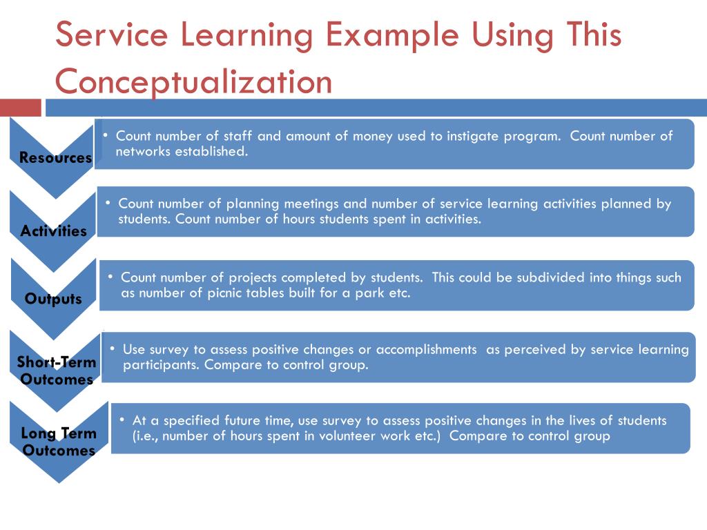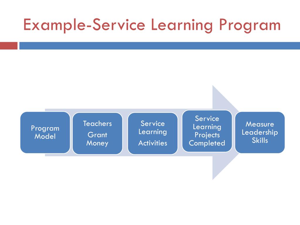 Evaluation Research. Evaluation Research. How do we begin? What are the different types of evaluation research? How do these different types fit together? What purpose do they serve?. Begin with a Logic Model. Other Common Terms Used to Identify Steps. Example-Service Learning Program.