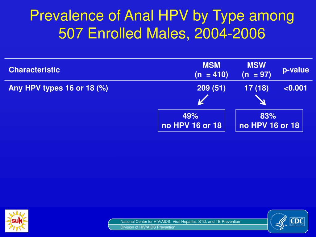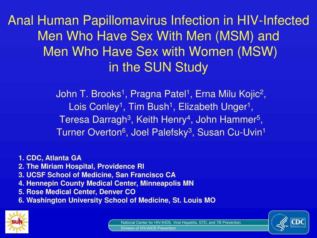 Anal Human Papillomavirus Infection in HIV-Infected Men Who Have Sex With Men (MSM) and Men Who Have Sex with Women (MSW) in the SUN Study. John T. Brooks 1 , Pragna Patel 1 , Erna Milu Kojic 2 , Lois Conley 1 , Tim Bush 1 , Elizabeth Unger 1 ,