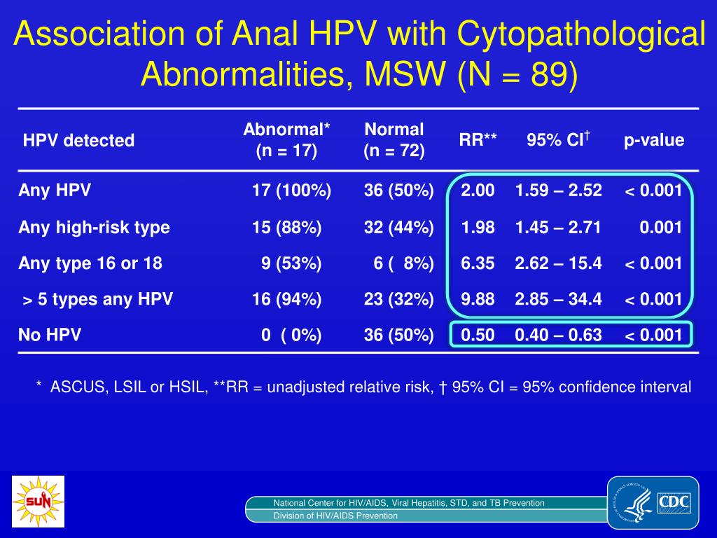 Association of Anal HPV with Cytopathological Abnormalities, MSW (N = 89) * ASCUS, LSIL or HSIL, **RR = unadjusted relative risk, † 95% CI = 95% confidence interval