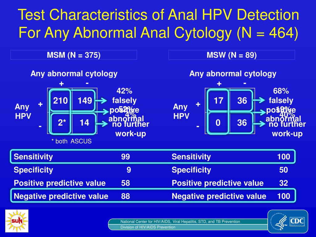 Test Characteristics of Anal HPV Detection For Any Abnormal Anal Cytology (N = 464) MSM (N = 375) MSW (N = 89) Any abnormal cytology Any abnormal cytology + - + - 42% falsely positive 68% falsely positive 210 149 17 36 + + Any HPV Any HPV 52% abnormal 19% abnormal 4% no further work-up 40% no further work-up 2* 14 0 36 - - * both ASCUS