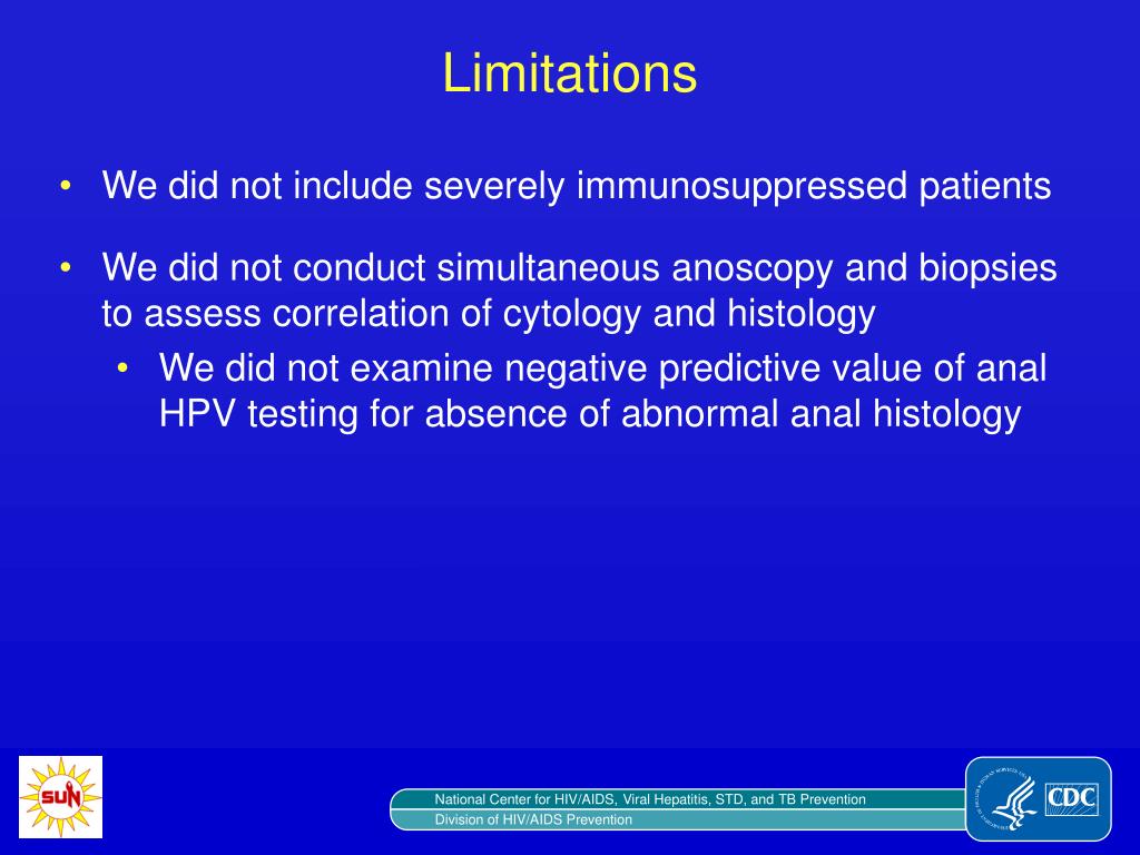 Limitations • We did not include severely immunosuppressed patients • We did not conduct simultaneous anoscopy and biopsies to assess correlation of cytology and histology • We did not examine negative predictive value of anal HPV testing for absence of abnormal anal histology