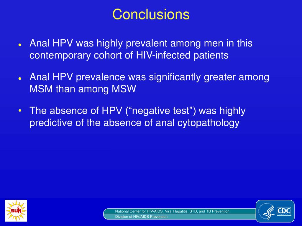 Conclusions • Anal HPV was highly prevalent among men in this contemporary cohort of HIV-infected patients • Anal HPV prevalence was significantly greater among MSM than among MSW • The absence of HPV (“negative test”) was highly predictive of the absence of anal cytopathology