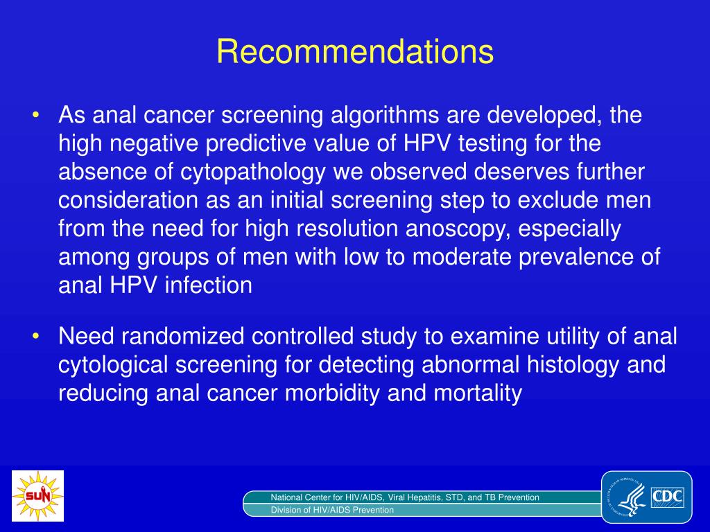 Recommendations • As anal cancer screening algorithms are developed, the high negative predictive value of HPV testing for the absence of cytopathology we observed deserves further consideration as an initial screening step to exclude men from the need for high resolution anoscopy, especially among groups of men with low to moderate prevalence of anal HPV infection • Need randomized controlled study to examine utility of anal cytological screening for detecting abnormal histology and reducing anal cancer morbidity and mortality