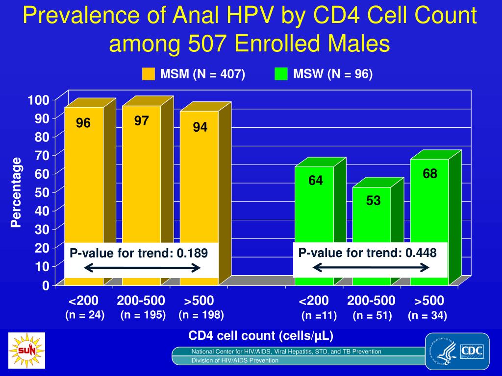 Prevalence of Anal HPV by CD4 Cell Count among 507 Enrolled Males MSW (N = 96) MSM (N = 407) (n = 24) (n = 195) (n = 198) (n =11) (n = 51) (n = 34) CD4 cell count (cells/µL) P-value for trend: 0.448 P-value for trend: 0.189