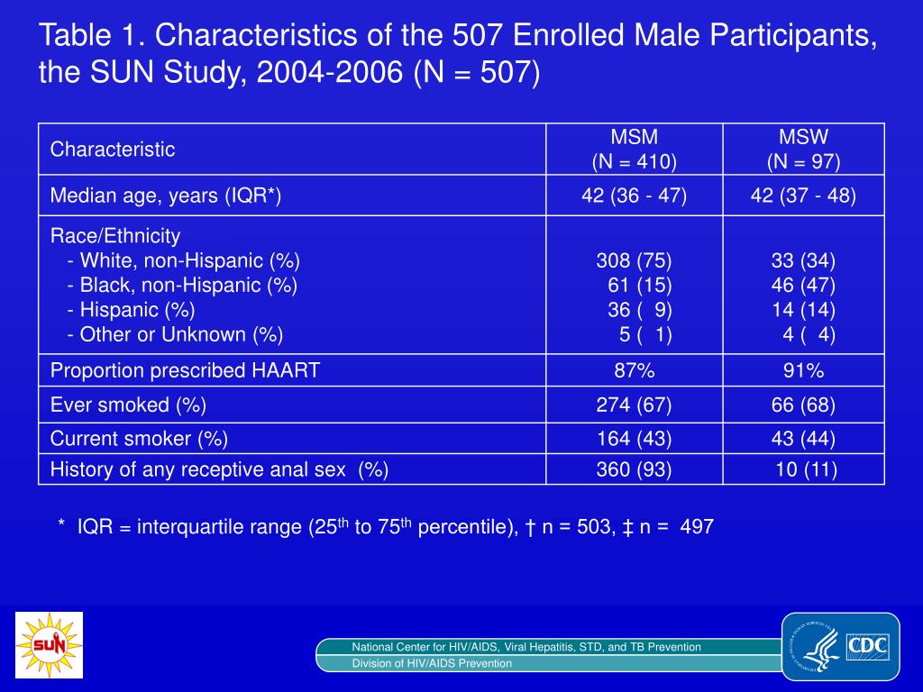 Table 1. Characteristics of the 507 Enrolled Male Participants, the SUN Study, 2004-2006 (N = 507) * IQR = interquartile range (25th to 75th percentile), † n = 503, ‡ n = 497