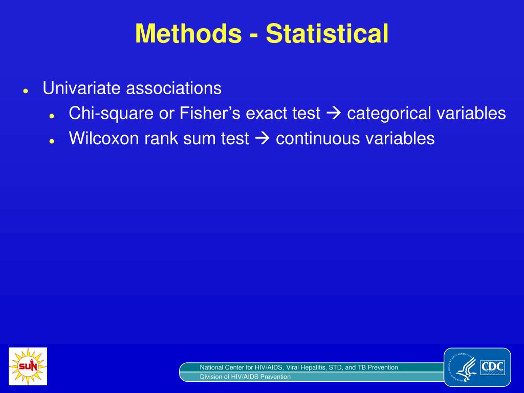 Methods - Statistical • Univariate associations • Chi-square or Fisher’s exact test categorical variables • Wilcoxon rank sum test continuous variables