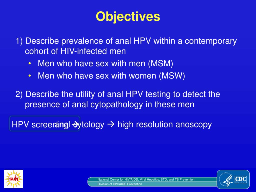 Objectives 1) Describe prevalence of anal HPV within a contemporary cohort of HIV-infected men • Men who have sex with men (MSM) • Men who have sex with women (MSW) • 2) Describe the utility of anal HPV testing to detect the presence of anal cytopathology in these men anal cytology high resolution anoscopy HPV screening
