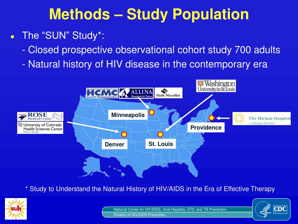 Methods – Study Population • The “SUN” Study*: - Closed prospective observational cohort study 700 adults - Natural history of HIV disease in the contemporary era Minneapolis Providence St. Louis Denver * Study to Understand the Natural History of HIV/AIDS in the Era of Effective Therapy